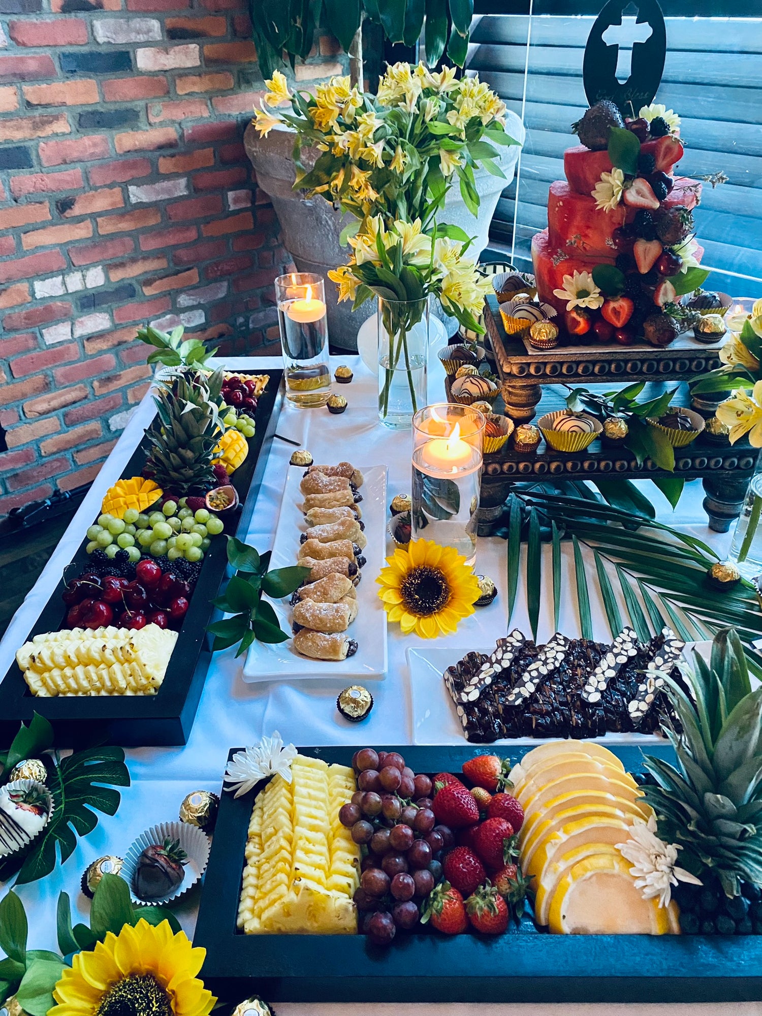 Our dessert table includes seasonal fresh fruit, chocolate covered strawberries, and assorted pastries.