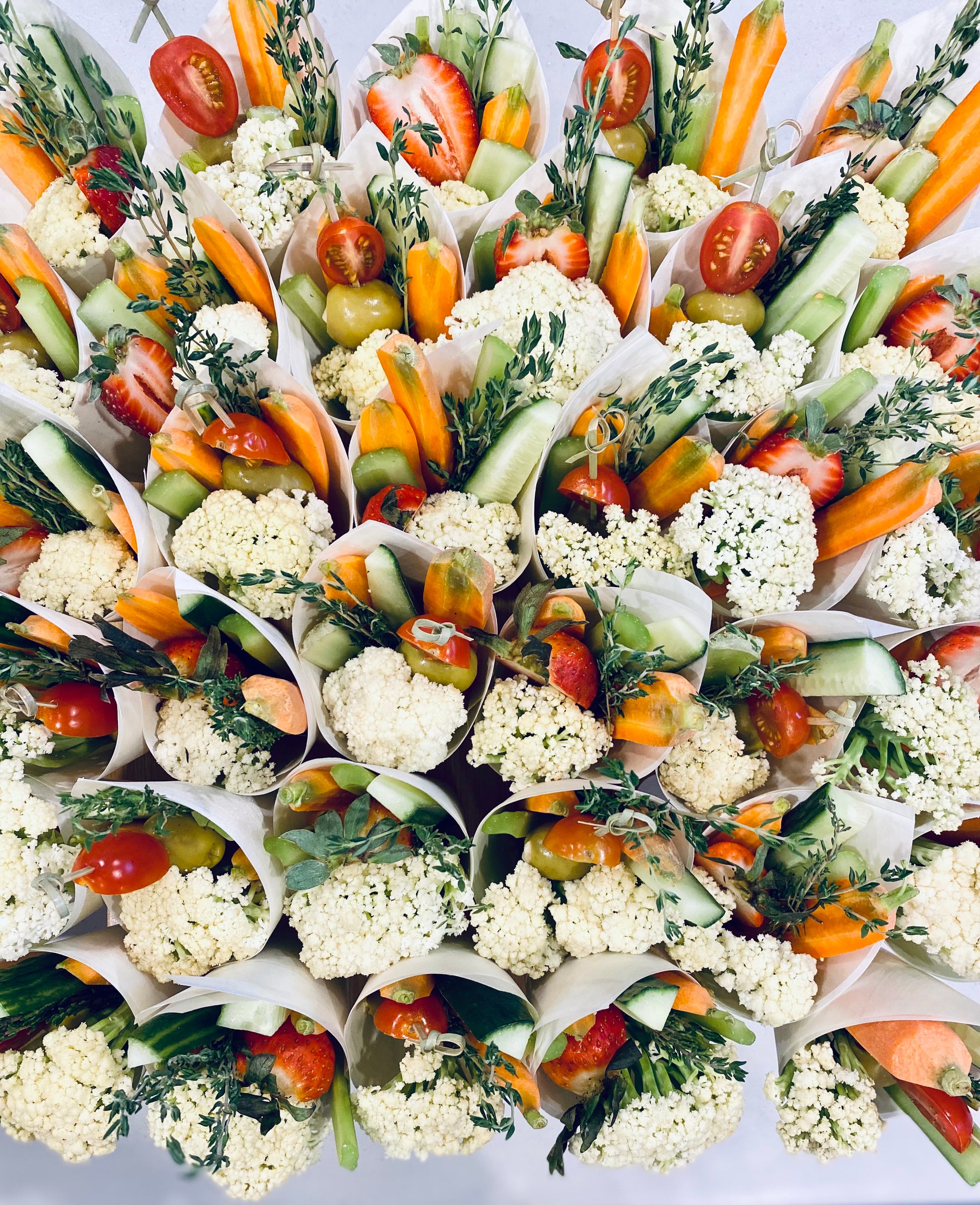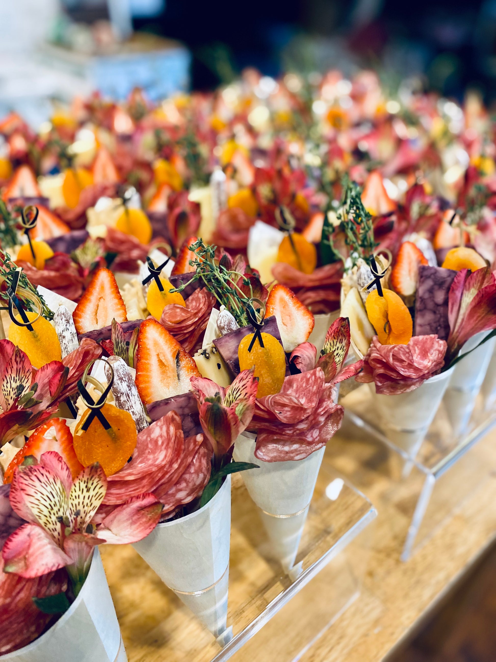 Chaque tasse/cône contient 1 charcuterie, 2 sortes de fromage, des craquelins artisanaux, des fruits de saison et des noix séchées.